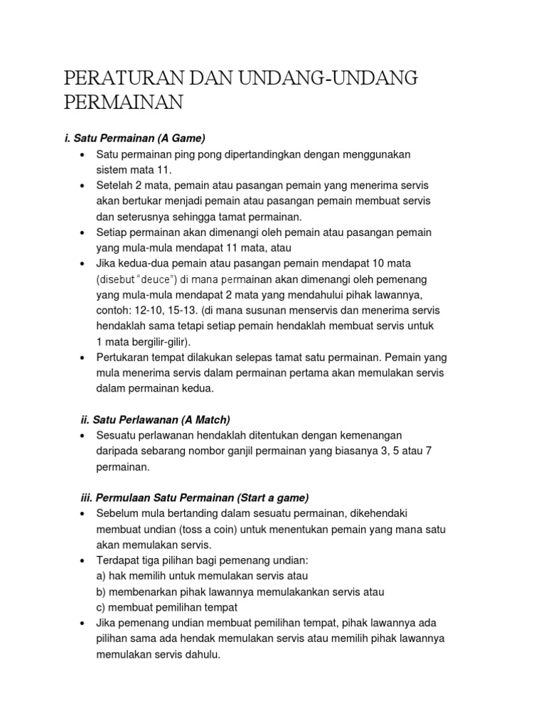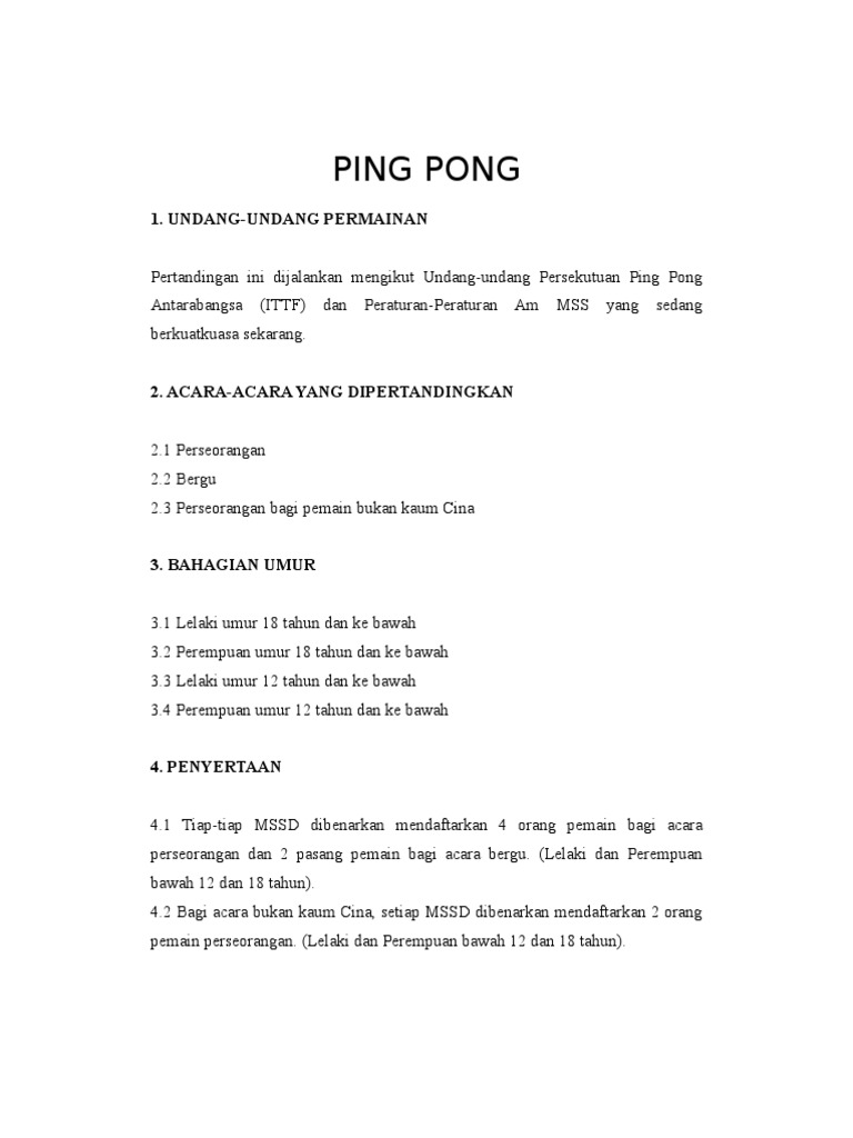 Tips Bermain Ping Pong | Peraturan Sukan Ping Pong ... from academyninjapingpong.com Dalam permainan ini, anda hanya perlu untuk memenangi lawan dalam ping pong. sekiranya pemain langgar meja dan meja bergerak dikira batal. Ping pong itulah nama permainan tenis meja yang lebih di kenal dalam masyarakat. Untuk memanfaatkan permainan pertama anda, lebih baik memilih seseorang dari tahap anda atau lebih baik. Setelah 2 mata, pemain atau pasangan pemain yang menerima servis akan bertukar menjadi pemain atau pasangan pemain membuat servis dan seterusnya sehingga tamat permainan. Sementara itu, meja itu perlu mengukur panjang 2.74 meter, lebar 1.525 meter dan. Satu permainan (a game) • satu permainan ping pong dipertandingkan dengan menggunakan sistem 11 mata. Page 1page 2page 3page 4.